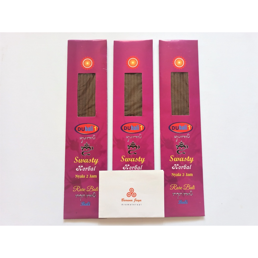 MOHON BACA SAMPAI AKHIR, KAMI TIDAK MELAYANI KOMPLAIN ATAUPUN PENGEMBALIAN PRODUKDibuat dari herbal murni, sehingga aman dan sehat untuk digunakan.Aromaterapi Ayur Herbal Bali Dubali Swasty Ungu, wanginya manis, lembut, hangat dan dominan segar khas rempah-rempah. Dibuat dari campuran kayu cendana, majegau, menyan, onem, umbi-umbian/akar-akaran, kemudian disatukan dengan minyak susu dan diproses sesuai tradisi serta kesakralan Bali.Digunakan sebagai aromaterapi, memberikan kita suasana nyaman, tenang, damai dan hangat, sekaligus mampu membersihkan udara dari residu-residu negatif.Sangat cocok digunakan untuk sembahyang, upacara, meditasi dan yoga. Dapat juga digunakan sebagai pewangi ruangan, galeri, butik, teman menulis, membaca, serta membangun atmosfer pertunjukkan.Aromaterapi berbentuk stick. Digunakan dengan cara dibakar seperti obat nyamuk bakar.Harga tercantum adalah harga 1 BUNGKUSFoto hanya ilutrasi keperluan estetis.Setiap bungkus berisi 9 batangTiap batang menyala : +/- 2 jam- Kemasan lebih besar dari bobot barang, karenanya berat barang dihitung berdasarkan volumetrik (panjang x lebar x tinggi x 1kg : 6000)- Silahkan pilih kurir sesuai kebutuhan Anda. Layanan kurir reguler memakan waktu lebih lama dibanding layanan kilat.- Setelah masuk kurir dan kami update no resi, maka barang ada di bawah tanggung jawab kurir. Apabila terjadi masalah pengiriman, kami hanya dapat membantu dengan mengontak kurir.- Enak tidaknya aroma adalah soal selera, kami sudah berusaha mendeskripsikan aroma di keterangan produk semampu kami, berilah review ataupun penilaian yang sesuai- Dengan berbelanja di Baruna Jaya Aromaterapi, maka Anda telah setuju dengan segala ketentuan di