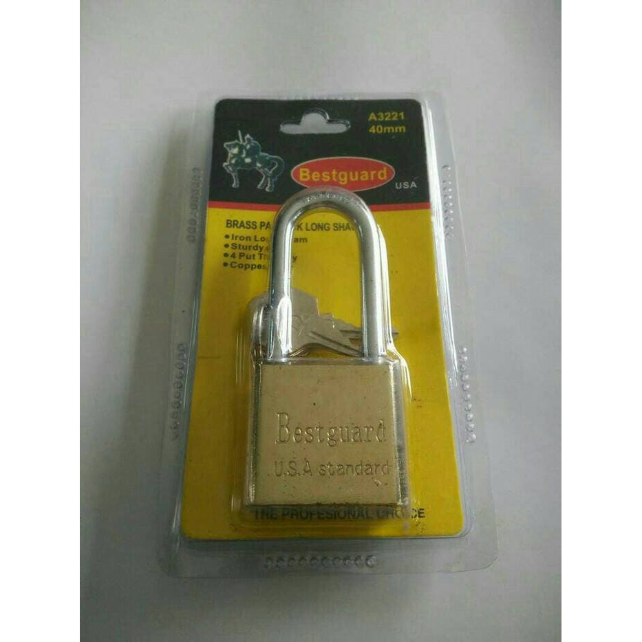 Gembok Bestguard Kuningterbuat dari bahan besi, tahan lamaAnak Kunci : 4 pcsCocok digunakan untuk rumah / toko