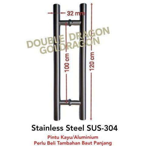 Pull Handle - Type : H- Dus : Polos (Produk Dari Ocius)- Material : Stainless Steel SUS-304Pemakaian :- Pintu Kaca ....tanpa perlu tambahan baut panjang.- Pintu Kayu....perlu tambahan baut panjang disesuaikan tebal pintu....lihat link baut panjang.- Pintu Aluminium Kaca....perlu tambahan baut panjang disesuaikan tebal pintu....lihat link baut panjang.Dimensi :- Panjang Seluruhnya : 1.200 mm (= 120 cm)- Panjang as kaki ke as kaki : 1.000 mm (= 100 cm)- Diameter : 32 mm (= 3,2 cm).Link untuk tambahan baut panjang utk Pintu Kayu dan Pintu Aluminium...https://shopee.co.id/product/35604645/6944462208?v=933&smtt=