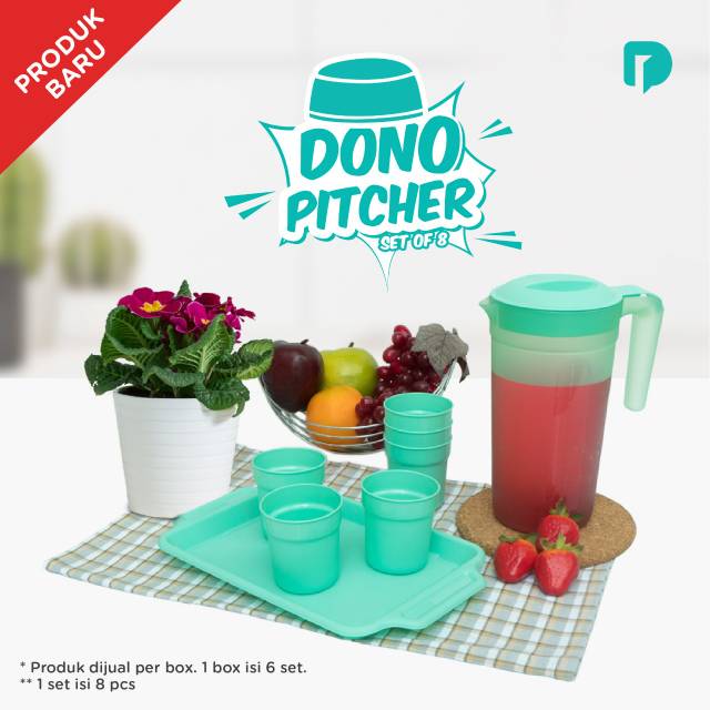 Eskan yang memudahkan Anda untuk menyajikan minuman segar untuk kumpul bersama. Cocok juga untuk menjamu tamu yang datang ke rumah. Kumpul bersama jadi lebih ceria dan meriah bersama Dono Pitcher Set of 8 Pcs.Kenapa jadi jagoan??- 1 set Dono Picher set sudah LENGKAP isinya.Ada pitcher uk. 2.2 L, 6 gelas dan nampan.. Kumplittt dan Praktis.- Harganya SUPER terjangkau, dijamin gak bikin kantong bolong Apa saja yang Anda dapatkan dalam 1 set- 1 Pitcher uk. 2.2 L , bisa buat minum seluruh keluarga- 6 gelas uk. 245 ml, banyak dan ideal untuk disajikan waktu kumpul2- 1 nampan yang pas buat 6 gelas. PRAKTIS!!Keunggulan produk :- Desain simple dengan warna hijau tosca yang FRESH- Penutup pitcher yang memudahkan saat buka tutup- Pegangan di sisi pitcher- Material plastik PP5 dan Food Grade, sehingga aman untuk minuman- Freezer Safe, aman dimasukkan ke dalam freezer untuk mendinginkan min