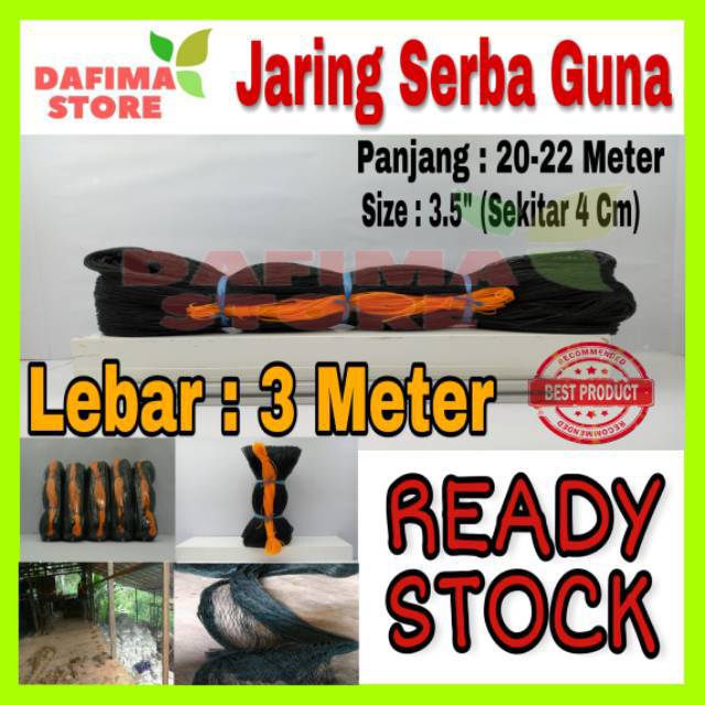 SEMUA STOK JARING DI TOKO KAMI SELALU READY. Jadi tidak perlu Tanya perihal Stok lagi. Bisa langsung Klik Beli atau Diorder. Terkecuali Pembelian Jumlah Besar Bisa Menghubungi Kami Terlebih Dahulu. Spesifikasi: Lebar : 3 MeterPanjang : 20 - 22 MeterSize : 4 Cm ( Ukuran Lubang )Tebal Benang: D6+ (0.7 mm) Bahan material : NylonFungsi :- Sebagai alat bantu petani untuk mengusir hama burung- Sebagai perangkap untuk dipasang pada gedung tinggi atau industri yang terganggu dengan adanya burung- Sebagai pelindung tanaman agar tidak di ganggu atau dirusak oleh kawanan burung- Sebagai perangkap burung kicau atau burung hias kita yang lepas- Dapat di gunakan sebagai keperluan ternak burung- Dapat di gunakan sebagai penutup sekat kandang pada unggas- Bahan dari nylon sehingga tahan cuacaNB : Lebar yang tertera sebelum terpasang (Lebar aktual setelah terpasang akan turun karena pengaruh tarikan jaring).Panjang yang tertera setelah terpasang (Panjang aktual setelah terpasang akan bertambah karena pengaruh tarikan jaring).#jaringserbaguna #jaringbagus #jaringayam #jaringkandang #jaringkandangayam #jaringtanaman #jaringpagar #jaringkolam #jaringburung #jaringtaman #jaring