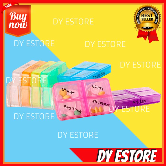 Kotak Obat 7 Days (-Terdiri dari 7 kotak utk pemakaian Seminggu)-Kotak obat unik terdiri dari 1 kotak besar yang dalamnya terdapat 7 kotak kecil, tiap kotak kecil warna berbeda dan terdapat tulisan monday, tuesday, wednesday, thursday, friday, saturday dan monday, memudahkan anda mengatur obat / supplemen yang dikonsumsi setiap hari.Di dalam tiap kotak obat terdapat 4 sekat, tiap sekat pada bagian tutup terdapat tulisan breakfast, lunch, dinner, bed time, fungsinya untuk memudahkan anda membedakan jenis obat atau supplemen yang anda minum setiap hari.Anda dapat isi obat / supplemen ke dalam kotak obat 7 days untuk pemakaian selama 7 hari. Dengan kotak obat ini anda gak bakal lupa atau salah minum obat. Kotak obat ini bakal bikin anda jadi telaten minum obat / supplemen.Cocok untuk dipakai baik anak-anak maupun dewasa. Cukup diingat hari ini hari apa dan angkat kotak obat sesuai hari yang tercantum di kotak obat, lalu selipin ke dalam tas sekolah atau tas kerja. Mudah dan praktisMaterial : Food Grade PlasticSize : 10.5 x 4.5 x 7
