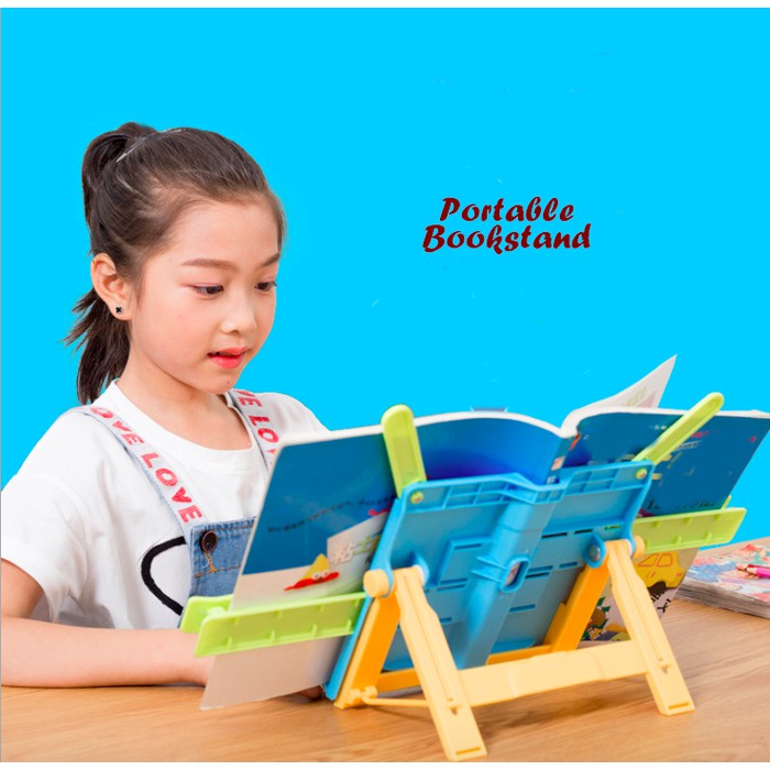 READY :- BIRU- TOSKA- PINKApakah tangan anak anda sering merasa pegal akibat kelamaan pegang buku pelajaran di rumah??Apakah anda kesulitan saat melafal kitab suci sambil berdoa??Hal-hal di atas pasti sering anda temui dalam kehidupan sehari-hari. Namun, semua hal di atas kini dapat atasi dengan Portable BookstandPortable bookstand adalah alat sandaran buku atau tablet. Bentuknya sangat portable, bisa dilipat jadi ukuran kecil, mudah dibawa kemana-mana.Alat ini wajib anda miliki di rumah untuk membantu anak-anak lebih fokus dan gak mudah pegal saat belajar di rumah. Portable bookstand sangat flexible, bisa diatur sesuai posisi yang paling nyaman. Belajar tanpa perlu repot pegang buku.Untuk ibu-ibu yang suka memasak, dapat memakai bookstand untuk tempat buku resep.Bagi anda yang hobby main alat musik seperti piano, bookstand ini memudahkan anda melihat buku musik anda dengan praktis dan nyaman saat sedang memainkan alat musik anda.Untuk yang hobby main tab atau iPad, bebaskan tangan anda dari rasa pegal akibat kelamaan pegang tab atau iPad, nonton atau main game gak pake pegal, nyaman dan praktis.Serbaguna bukan?? 1 bookstand dapat dipakai untuk berbagai keperluan.Spesifikasi :- Pada bagian atas sandaran buku terdapat 2 penahan, untuk menahan buku yang ukuran lebih tinggi- Samping kiri kanan terdapat jepitan buku, jepitan buku dapat digeser dan diatur hingga posisi yang pas untuk buku- Bagian bawah juga terdapat penahan buku, dengan penahan ini buku ga bakal jatuh dari bookstand.- Terdapat lobang di bagian tengah khusus untuk pinggiran buku saat posisi buku dibuka, agar posisi buku tetap rata.Panduan pemakaian :- Buka kaki penyangga bookstand, atur hingga posisi datar seperti meja- Jepit buku ke bookstand- Lalu tarik sandaran buku ke arah bawah, atur hingga posisi yang pas dan nyaman.Kemasan menggunakan kotak berwarna, cocok juga untuk kado atau hadiah !!Size : Ada di gambarMaterial : Pl
